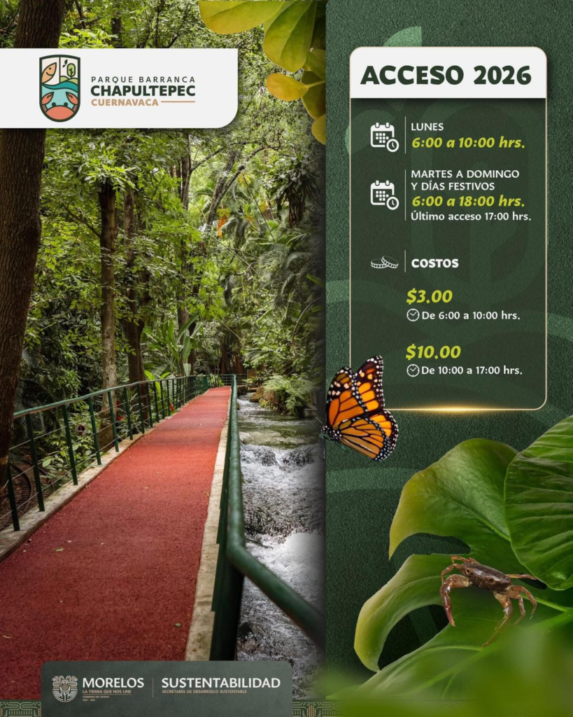 La Secretaría de Desarrollo Sustentable (SDS) informó que a partir del 5 de febrero se aplicará un ajuste de un peso en la tarifa de acceso matutino al Parque Estatal Urbano Barranca de Chapultepec, uno de los principales espacios naturales de la capital morelense.